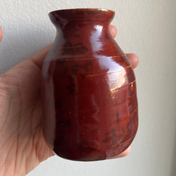 Dit mooie, mini vaasje heeft een roodbruine kleur. Het heeft hoogte van ongeveer 8 cm.